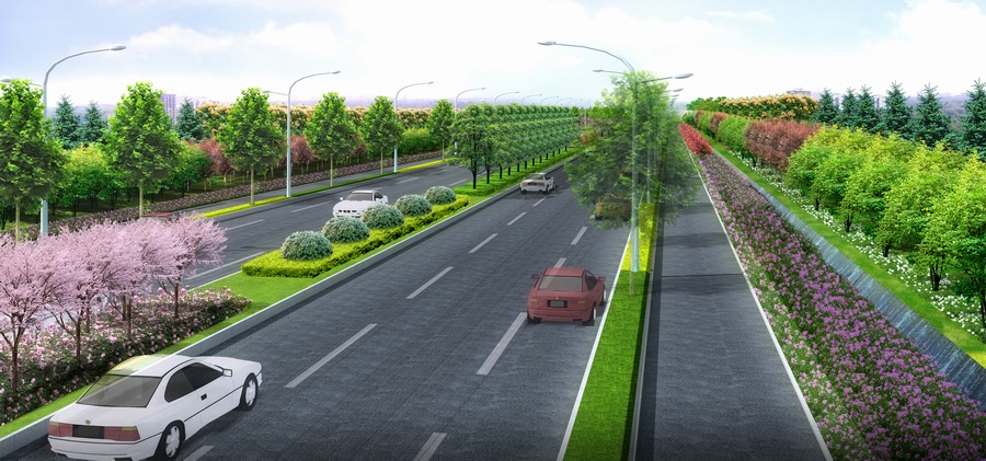 項(xiàng)目規(guī)模:道路全長12.6km,中分帶寬4m,兩側(cè)綠化帶各寬20m,綠化面積為55.4公頃。