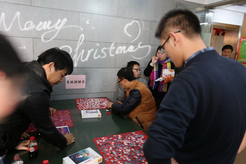 伴隨著浪漫的圣誕音樂,圣誕老人滿載著大家的期盼閃亮登場,開始派發(fā)寓意著幸福和快樂甜蜜的糖果、巧克力、愛心小禮物等。隨后,“圣誕拼拼樂”、“按圖索驥”、“互換禮物”等環(huán)節(jié)也陸續(xù)精彩呈現(xiàn)。