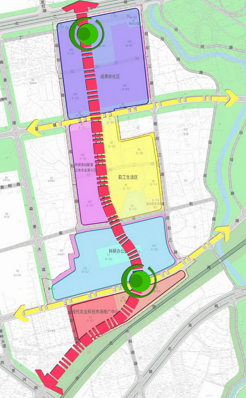■“五區(qū)”:成果轉(zhuǎn)化區(qū)、科研基礎配套及立體農(nóng)業(yè)展示區(qū)、職工生活區(qū)、科研辦公區(qū)和商業(yè)服務區(qū)。