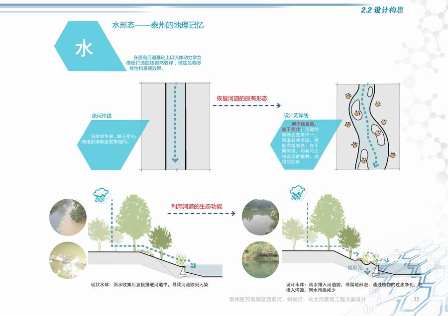 “水”的處理:針對(duì)城市河道排澇功能強(qiáng)、生態(tài)景觀功能弱的特點(diǎn),結(jié)合泰州獨(dú)特的地域特征,在現(xiàn)狀駁岸的基礎(chǔ)上進(jìn)行二次景觀處理,以相關(guān)技術(shù)為依托,恢復(fù)原始自然河道的“地理記憶”。