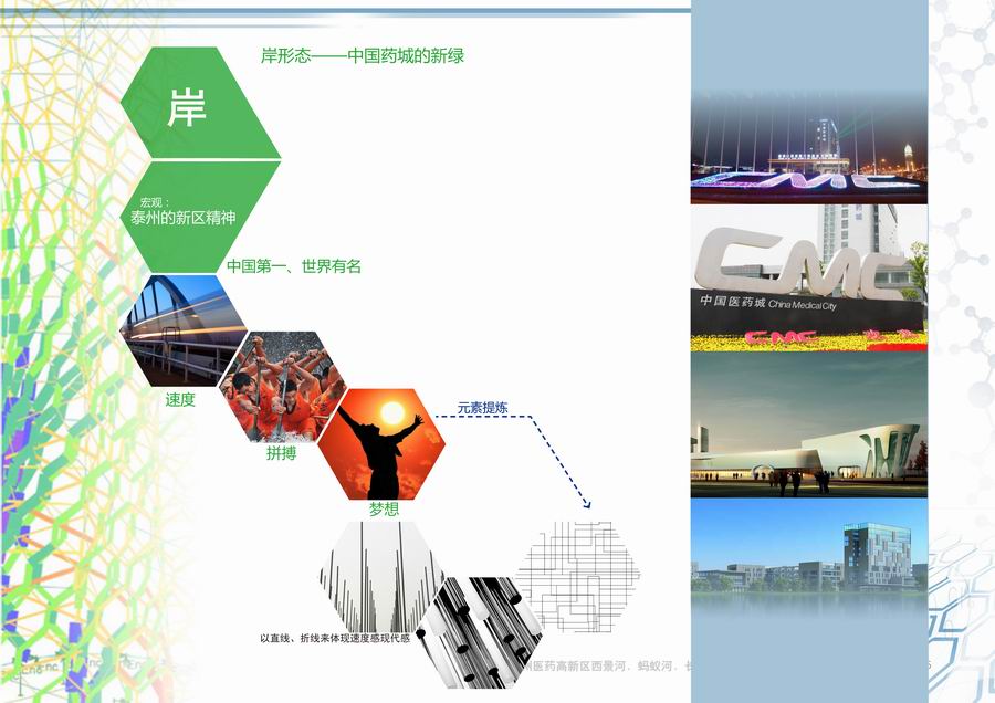 “岸”的設(shè)計(jì):宏觀上將醫(yī)藥高新區(qū)積極向上、刻苦研發(fā)的精神提煉成為剛勁的線條與現(xiàn)代感的圖形應(yīng)用于岸的造型、景觀小品的形式、鋪裝的樣式、種植面的造型上,將原有單調(diào)的水岸形式打造成為既現(xiàn)代又富有創(chuàng)新的綠色生態(tài)帶。微觀上,將藥分子的造型解構(gòu)、重組,提取圖形元素作為坐凳、樹穴、小品的造型與鋪裝面的造型符號(hào),使行人能夠感受到藥城的獨(dú)特感與科技感。