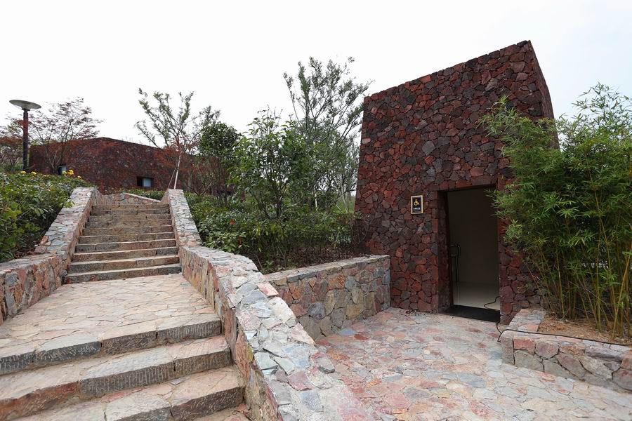 基地西側(cè)為公園環(huán)山路,東側(cè)為城市道路,高差相差6m,利用臺地式分層有效化解高差。在環(huán)山路與停車場之間設(shè)置綠色屏障,進(jìn)行空間分割與生態(tài)防護(hù)。同時(shí)結(jié)合地形設(shè)計(jì)公共衛(wèi)生間,與地形鑲嵌在一起。男女衛(wèi)生間于地勢中央,入口分立,保證私密性,無障礙衛(wèi)生間設(shè)置于停車場高程處,整體采用火山巖材料,與環(huán)境有機(jī)融合。公共衛(wèi)生間的建成將服務(wù)東入口整個(gè)片區(qū)。