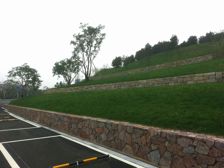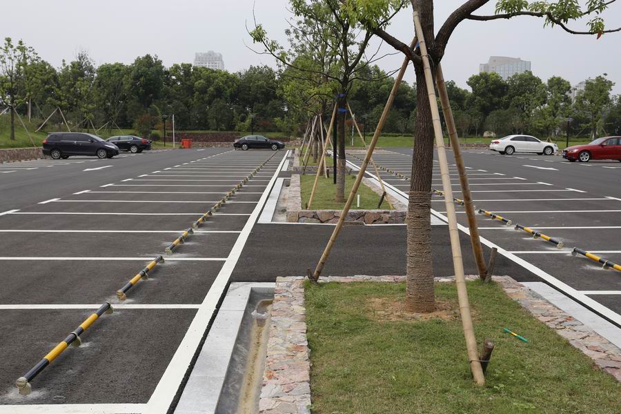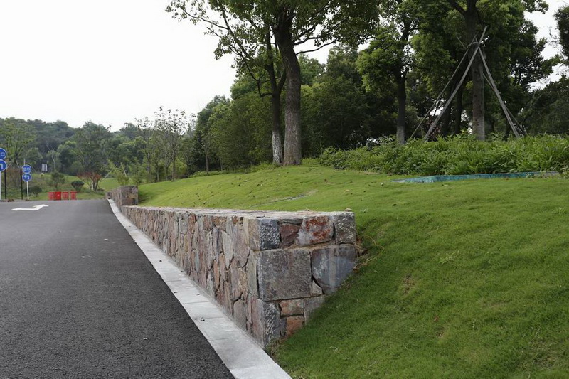 設(shè)計(jì)采用銹鋼板、毛石等材料,在重要視覺節(jié)點(diǎn)處設(shè)立景觀標(biāo)識,豐富空間要素,給游人以良好的景觀體驗(yàn)。入口處折型銹鋼板擋墻,結(jié)合融合標(biāo)識系統(tǒng)、地形防護(hù)的功能,是停車場在燕山南路上重要的視覺節(jié)點(diǎn)。