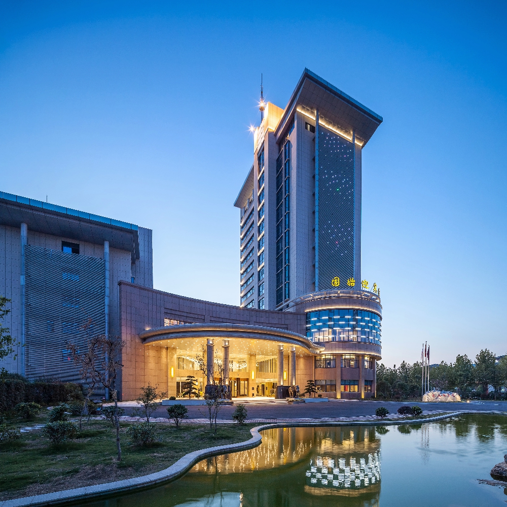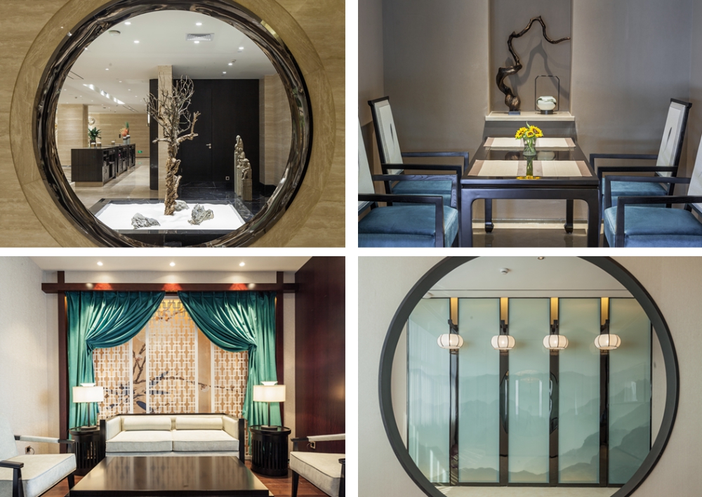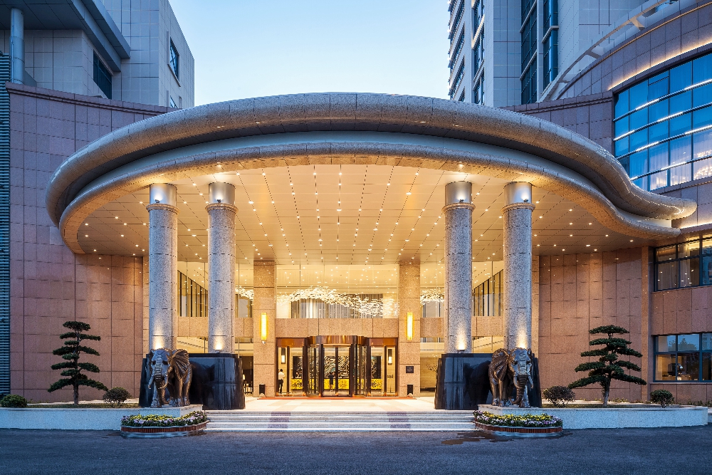 建筑入口簡(jiǎn)潔開(kāi)闊,銜接室內(nèi)室外的空間,檐口弧線與餐廳幕墻一筆連通、錯(cuò)落有致。使整棟建筑拔地凌空、氣勢(shì)恢宏,是名至實(shí)歸的“地標(biāo)”酒店建筑。