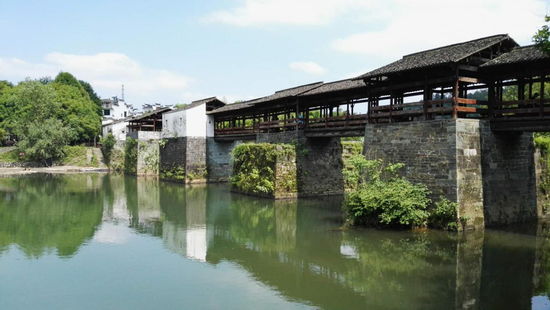彩虹廊橋:建于南宋,距今800多年,堪稱婺源廊橋代表之作,被各媒體譽為中國最美的廊橋,是省級重點保護(hù)文物。橋名取自唐代詩人李白的佳句“兩水夾明鏡,雙橋落彩虹”。此橋長140米,橋面寬3米多,4墩5孔,由六亭五廊組成。每墩上建一兩懸山坡頂亭,墩間的跨度部分稱營建成輕巧連廊。遠(yuǎn)觀,亭略高于廊,形成錯落有致的形體。廊亭中有石桌石凳,供行人休憩小坐。廊橋周圍景色優(yōu)美,青山如黛,碧水澄清,宛如圖卷。