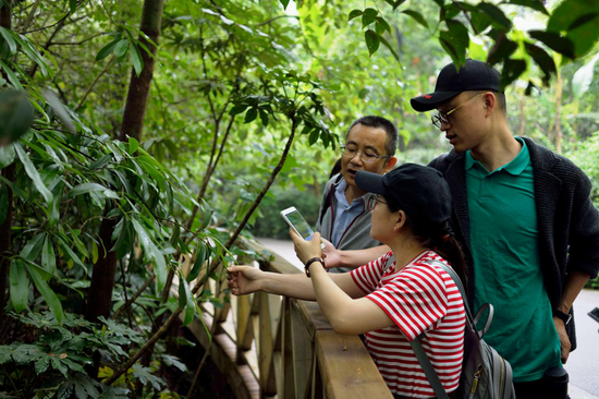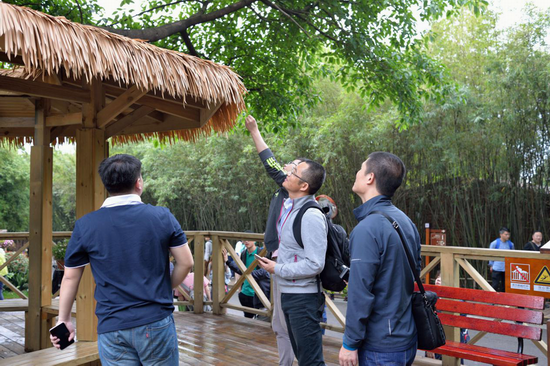 熊貓繁育研究基地坐落于成都北郊斧頭山是成都,乃至整個四川旅游,的招牌?;亟ǔ闪丝蒲写髽?、開放研究實驗室、獸醫(yī)院、獸舍和熊貓活動場、天鵝湖、大熊貓博物館、大熊貓醫(yī)院、大熊貓廚房等,既是大熊貓繁育科研機構(gòu)、科普場館,也是適宜大熊貓及多種珍稀野生動物野外生息繁衍的生態(tài)公園?;丶匀簧揭帮L(fēng)光和優(yōu)美人工景觀為一體。除了憨態(tài)可掬的國寶熊貓,精致的景觀建筑小品和極具地域特色的豐茂植被也撩起了亦境考察團的強烈興趣。小伙伴們紛紛打開手機上的植物識別軟件,一路探究,盡顯專業(yè)精神。