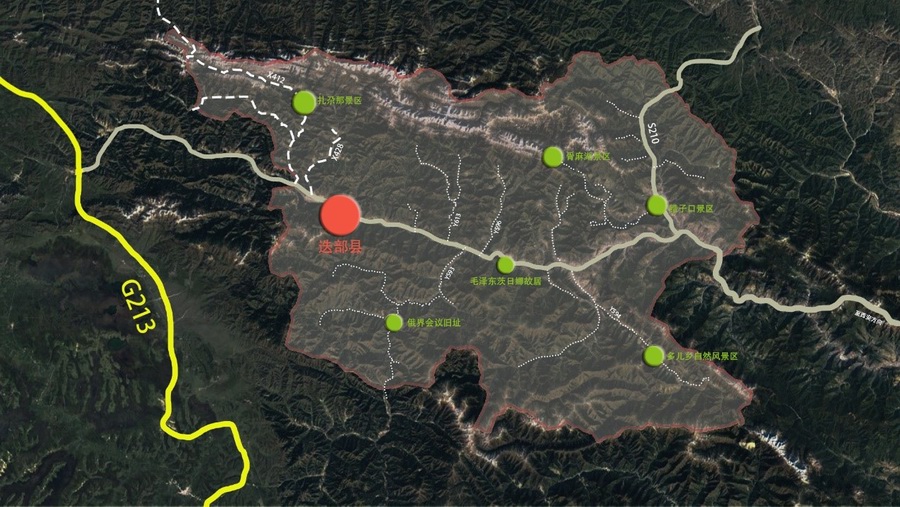 項目選址就位于扎尕那景區(qū)所在的迭部縣,北鄰橫跨中心城區(qū)的白龍江,南依山體,南部遠處為迭部縣的重要景點-虎頭山,面積約355公頃。