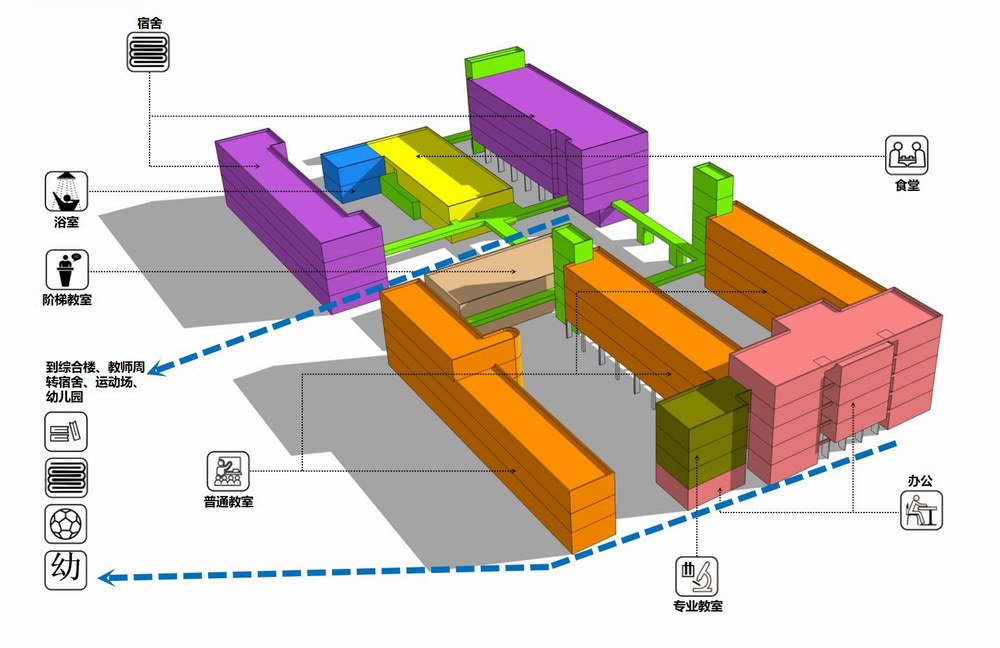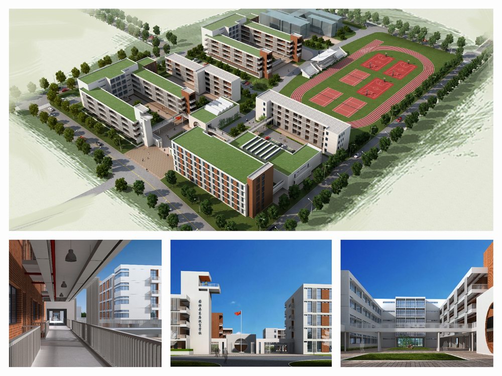 項(xiàng)目基地交通組織與其周邊整體協(xié)調(diào),其西側(cè)、東側(cè)分別設(shè)置行政和后勤出入口,分別同鄉(xiāng)村路連接。南側(cè)居中布置主入口,并在校門外與鄉(xiāng)村路之間設(shè)置緩沖場(chǎng)地。校園內(nèi)交通組織圍繞師生日?;顒?dòng)展開,除西側(cè)部分機(jī)動(dòng)車通行道路為瀝青路面外,主要通過(guò)硬質(zhì)景觀鋪裝和耐踐踏綠化聯(lián)系各功能區(qū),滿足平時(shí)步行交通和應(yīng)急機(jī)動(dòng)車通行需要。主要建筑之間設(shè)置風(fēng)雨連廊,即使雨雪天氣,師生們也能便捷地穿行于安全干爽的檐下通道。