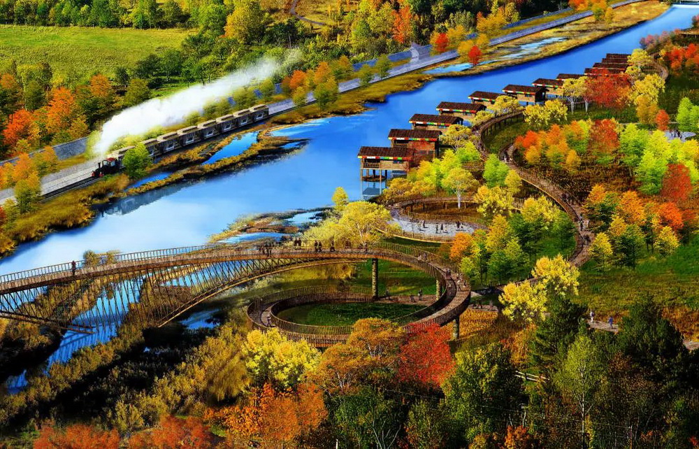 ↑? 沿白龍江設(shè)置架空的水磨坊和空中棧道以保留生物遷徙通道,清潔能源觀光車控制汽車尾氣污染,打造濱水生態(tài)長廊。