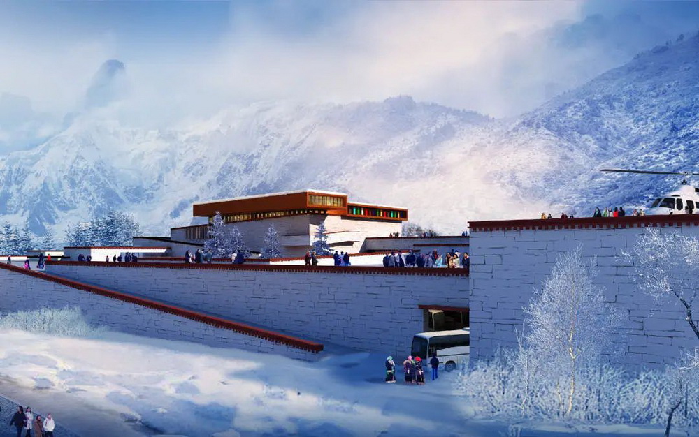 ↑ 功能復(fù)合、退臺(tái)式的小體量建筑依山就勢而建,以藏族的紅白色為基底,就地取材,以實(shí)現(xiàn)對場地的最小干預(yù)。