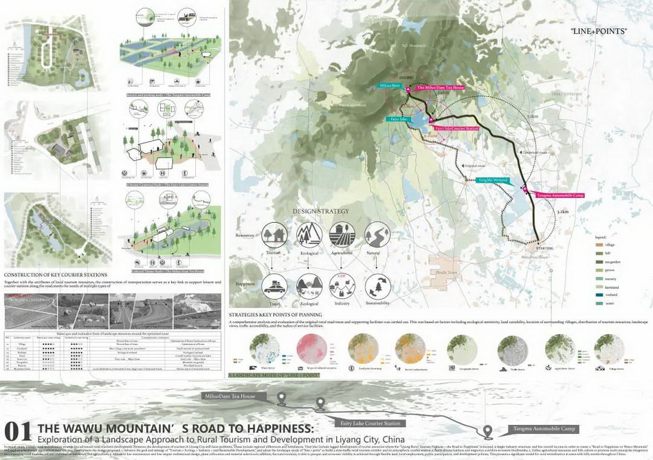 設計提出“旅游+、生態(tài)+、產(chǎn)業(yè)+、可持續(xù)+”的目標與策略,采取“線+點”的景觀模式,構(gòu)建鄉(xiāng)村慢行旅游廊道和特色驛站;營建多樣性棲息地和遷徙廊道,恢復生物多樣性;挖掘鄉(xiāng)土農(nóng)業(yè)資源和民俗文化,推動鄉(xiāng)村旅游、文創(chuàng)產(chǎn)業(yè)與農(nóng)業(yè)的多產(chǎn)業(yè)融合;堅持低維護、低影響的建筑設計、植物搭配和材料選用。旨在打造通往瓦屋山的幸福之路,探索中國溧陽市鄉(xiāng)村旅游發(fā)展的景觀途徑。
