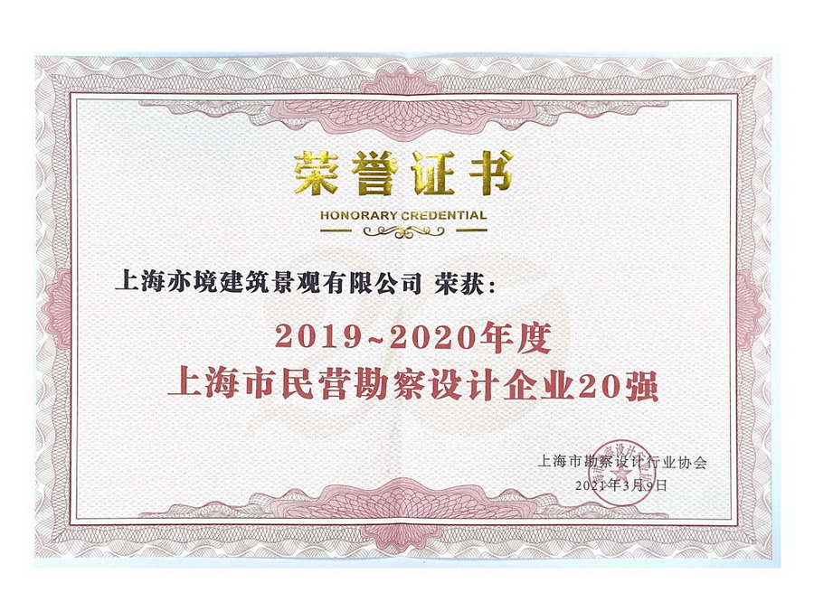 近期,上海市勘察設(shè)計(jì)行業(yè)協(xié)會(huì)公示了“2019-2020年度上海市民營勘察設(shè)計(jì)企業(yè)20強(qiáng)推介活動(dòng)”的評選結(jié)果,亦境榮獲上海市民營勘察設(shè)計(jì)企業(yè)20強(qiáng)、工匠20杰、優(yōu)秀設(shè)計(jì)項(xiàng)目20佳三項(xiàng)榮譽(yù)。