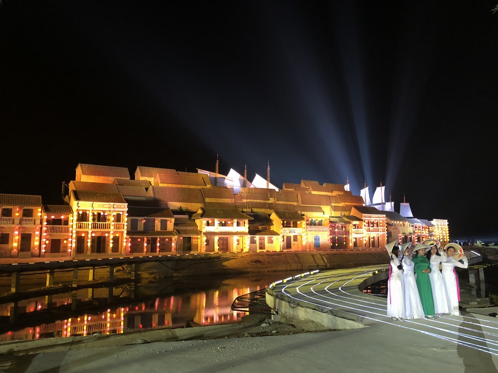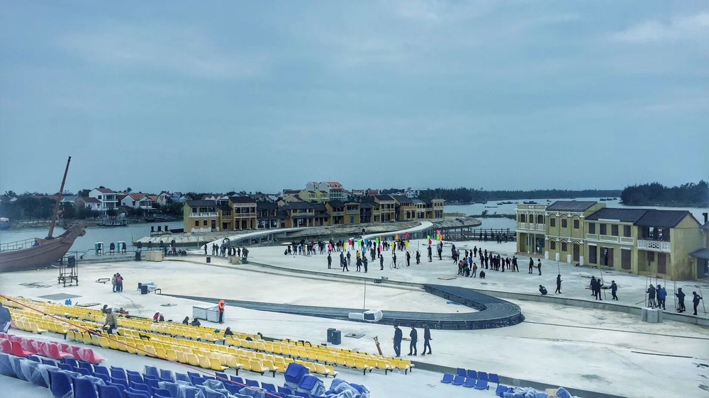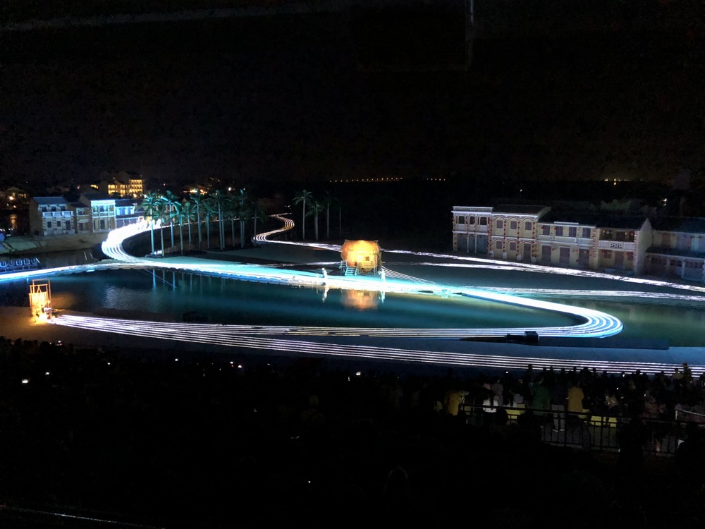 此次演出的室外實(shí)景演藝區(qū)是越南“印象會(huì)安”主題樂園項(xiàng)目的首期工程,位于整體項(xiàng)目用地的東端,占地面積約33畝,觀眾席設(shè)普通座位3300個(gè),VIP座位90個(gè)。舞臺(tái)區(qū)利用機(jī)械方式將變化豐富的固定布景、升降布景及移動(dòng)布景,與大型歌舞、多媒體水景燈光秀相結(jié)合,完美詮釋了會(huì)安古城百年的變遷,以及中、日、歐各種文化風(fēng)格與會(huì)安當(dāng)?shù)卦侥衔幕娜诤?。震撼的演出效果激發(fā)了觀眾的熱烈反響,也得到中越藝術(shù)和媒體領(lǐng)域的廣泛贊譽(yù)。本項(xiàng)目的大型室外實(shí)景山水演出,已經(jīng)由越南政府確定為向世界各國(guó)元首獻(xiàn)禮的越南文化展示項(xiàng)目。
