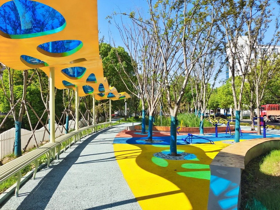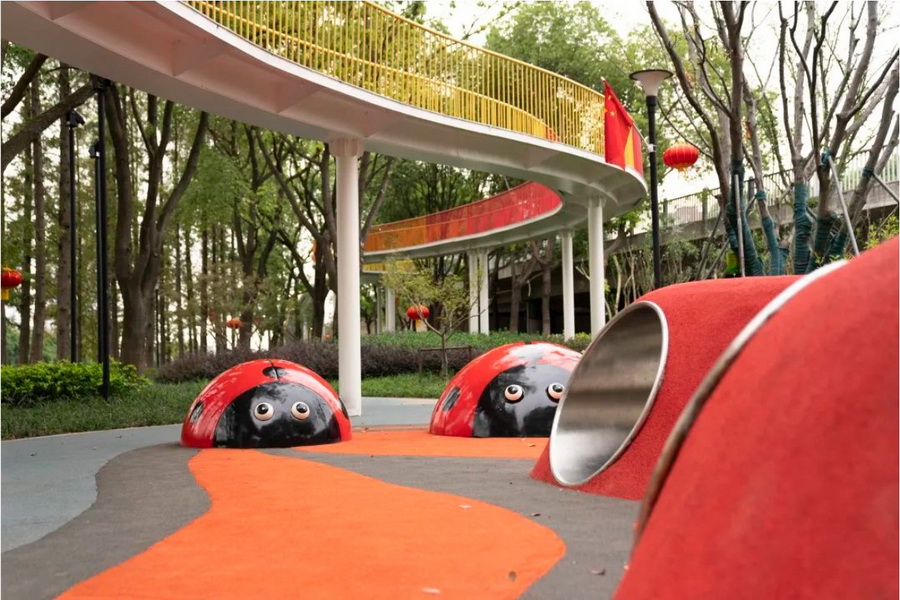 Q+同心花園位于柏廬大橋附近,以明亮活潑的色彩和趣味圖案噴繪讓人眼前一亮。橙色能代表童趣與溫暖,也是Q+同心花園的主打色。各式游樂設(shè)施給孩子們提供了游樂的小天地,鋪裝采用安全、防滑材質(zhì),保證了兒童活動的安全性。涼亭和休憩座椅給大人和孩子提供了短暫休息的場所。