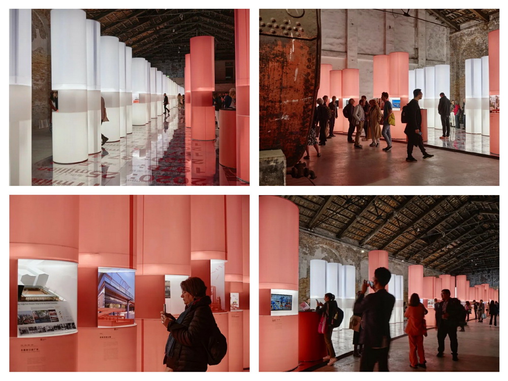 中國國家館室內(nèi)展陳:由50余幅巨大的“卷軸”構(gòu)成柱廊構(gòu)成,恍如置身森森樓宇,參觀者在“觀畫”“展讀”“凝視”和“漫步”中尋求應(yīng)對現(xiàn)實的答案和對未來的想象。