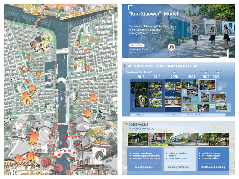展品“昆小薇”模式——江蘇昆山老城區(qū)公共空間更新實踐:以插畫的形式,展現(xiàn)了通過公共開放空間微更新策略,恢復(fù)了昆山市老城區(qū)“T”字水軸兩岸的繁榮生活場景,彰顯了昆山水城交融、古今共融、水墨江南的濱水公共空間意向,突出表達(dá)了昆小薇模式如何回應(yīng)老舊社區(qū)居民對美好生活的追求。
