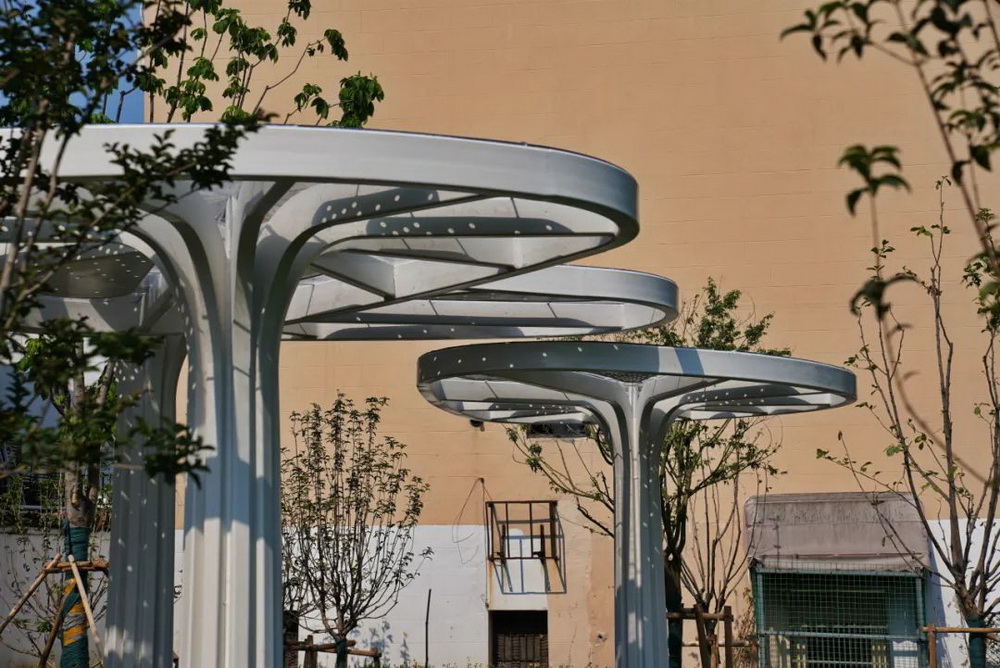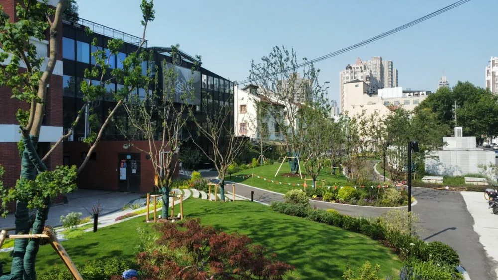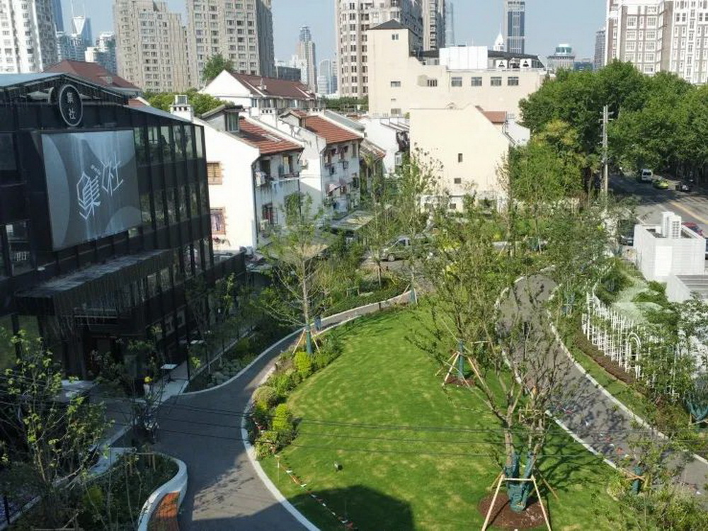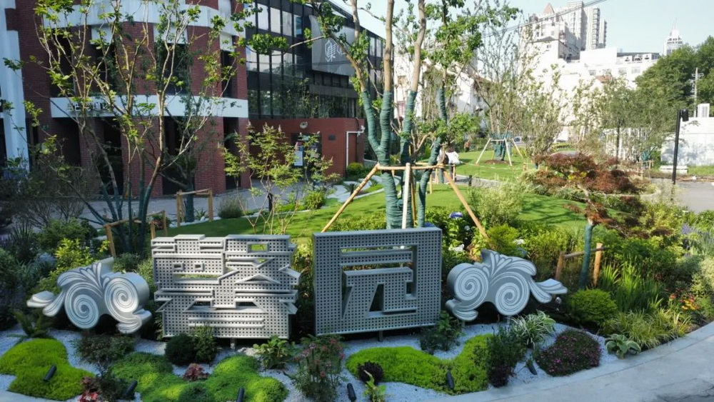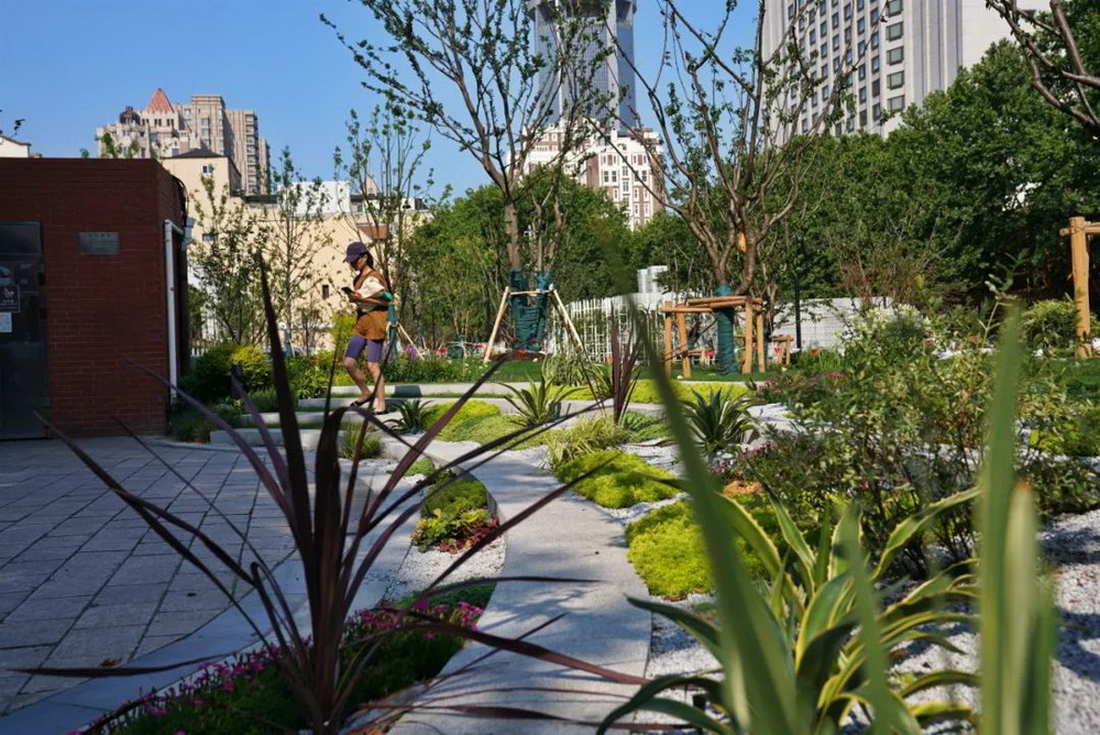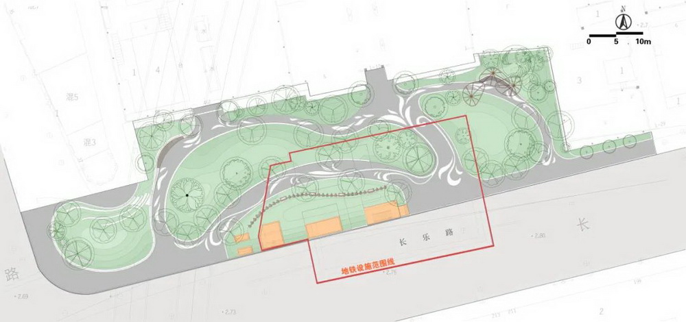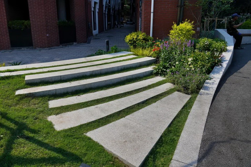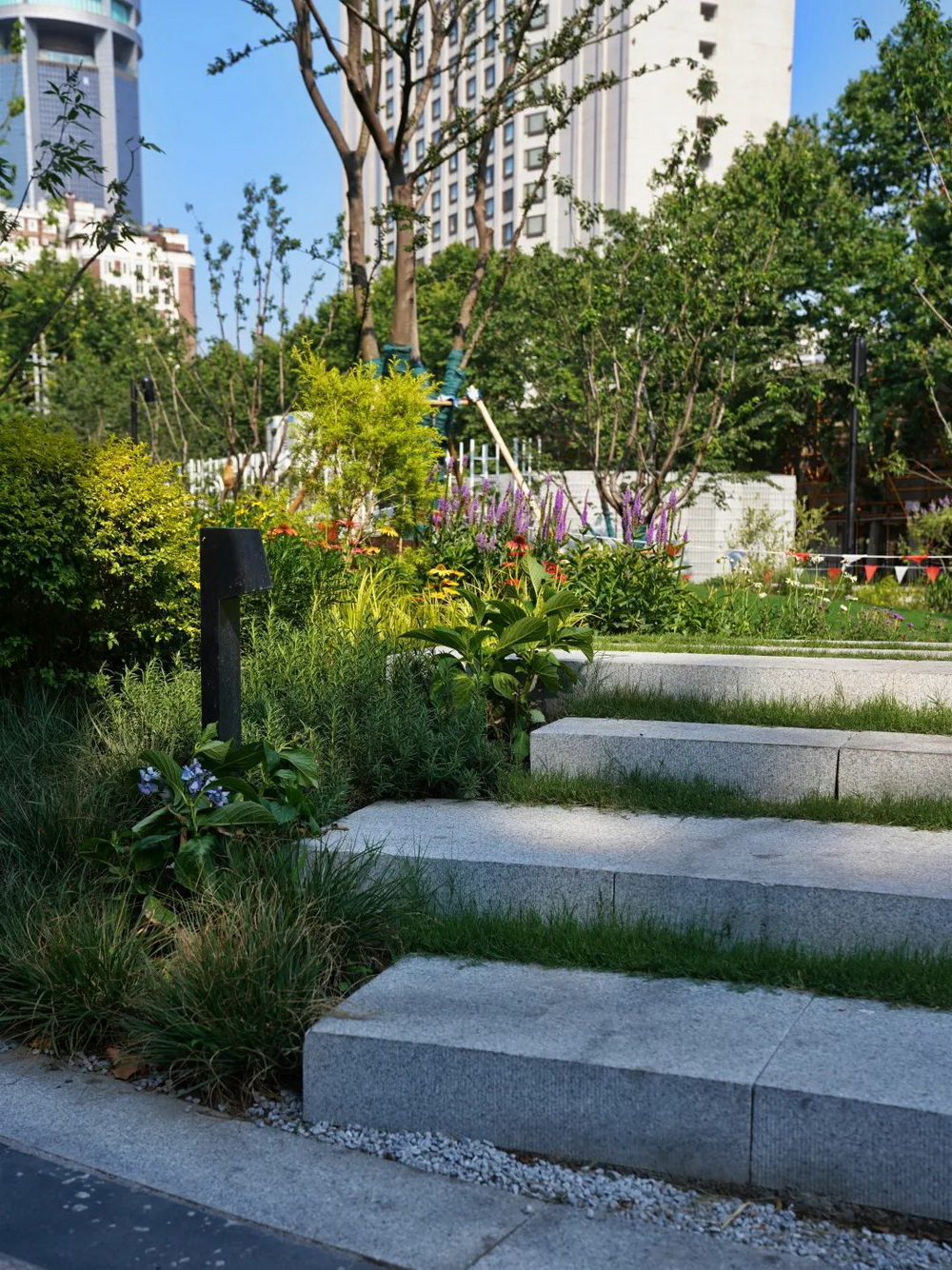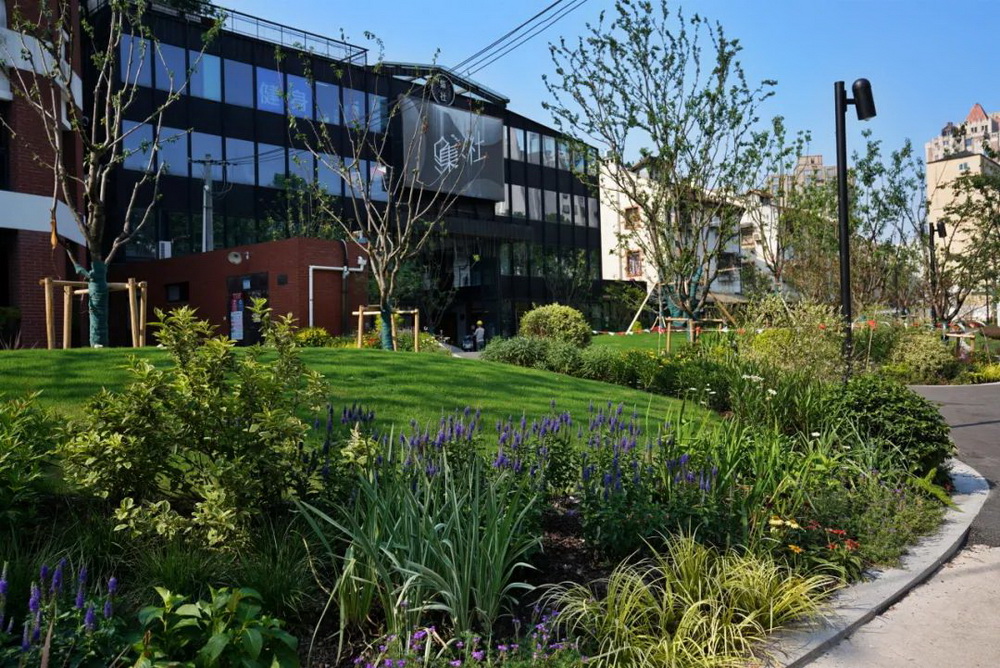 這個小花園肩負(fù)著多重使命,既要有老上海弄堂記憶的文藝范,又要有日常生活的煙火氣。作為長樂路上為數(shù)不多的綠色開放空間,滿足居民日常的綠色休閑需求的同時,兼顧著居民駕車出行、商家出入、市民探店、人行道穿行其間的多重需求。設(shè)計通過一條200m長的步行道,將碎片化的綠地串聯(lián)在一起,形成“東北幽、西南闊”的布局,在基地東北角配置亭廊構(gòu)架與坐憩設(shè)施,打造靜謐休憩空間,而在西南角,以起伏的草坡和自然花境,與喧鬧的街角隔而不檔,主題LOGO凸顯了這個長樂路上綠色新地標(biāo)的形象,一起加入city walk,探秘城市中的自然。