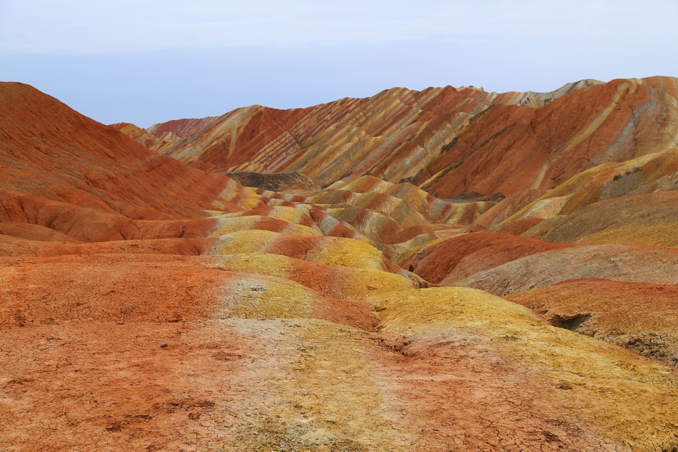 七彩丹霞地貌最震撼人的便是顏色,在黃昏時(shí)間更加變幻無(wú)窮。一層黃色、一層紅色再配上一層淡淡的土灰色,層次分明、線條曲折。紅的如火,黃的似金,灰的如鋼,顏色相配的異常醒目,看后不由得佩服大自然的鬼斧神工。