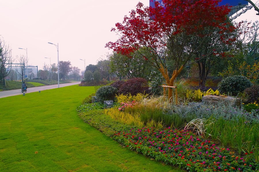 通過塑造延綿起伏的地形,打破原有平坦地形的單調(diào)感,在有條件的局部區(qū)域形成安歇角為30-45度的島狀地形,為“島鏈?zhǔn)健钡木坝^結(jié)構(gòu)的構(gòu)建打下了基礎(chǔ),同時有效地改善了綠地的排水。植物種植強(qiáng)化地形的起伏感,高坡上的種植以層次豐富的組團(tuán)式群植為主,緩坡及草坪上散植大樹,從而打破了道路兩側(cè)空間原有的擁堵感,形成疏密有致、開閉有序的起伏曲折的韻律空間。