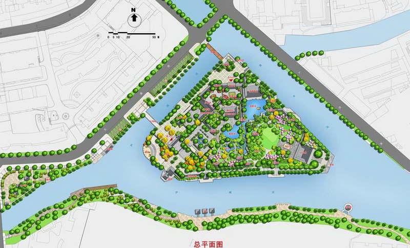 高靜園采用外“環(huán)”內(nèi)“網(wǎng)”,外松內(nèi)緊的空間分部格局。立足城市規(guī)劃角度,打破公園四周原有的密閉圍墻,使園中景和園外景相互滲透。島上沿公園四周河岸形成環(huán)路,同時(shí)滿足消防通道之需,通過濱水步道、眺臺(tái)、碼頭等既具有現(xiàn)代氣息,亦不乏民族傳統(tǒng)裝飾風(fēng)格的景觀載體,將視線過渡到島外周邊城市景觀。
