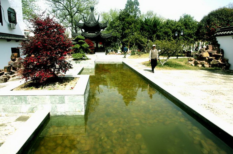 景點(diǎn)“一方天地”在原有盆景園基礎(chǔ)上改建而成。為襯托盆景之虬枝奇石,園中水池、地面鋪裝均采用簡潔的直線條和淺色調(diào),既使得方寸之間,別有洞天。