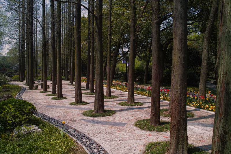 3.與現(xiàn)狀植物的保護相結(jié)合,在遺存核心古園外圍,因地制宜地增辟人性化的公共活動場所,拓展林下空間。保留改造范圍內(nèi)所有胸徑250px以上的喬木和帶基礎(chǔ)的大型盆景,并對古樹名木進行復壯養(yǎng)護。在香樟林、水杉林下,以花街鋪地形成邊界富于變化的硬質(zhì)場地,其透水、透氣性為保留喬木的根系繼續(xù)生長提供了良好生態(tài)環(huán)境,也為游客提供了舒適宜人的林下健身休閑活動空間。