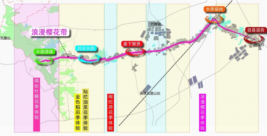 通過(guò)舊縣迎客、水西福地、姜下聚賢、呂莊水韻、半山游驛來(lái)提升旅游道路的識(shí)別性。