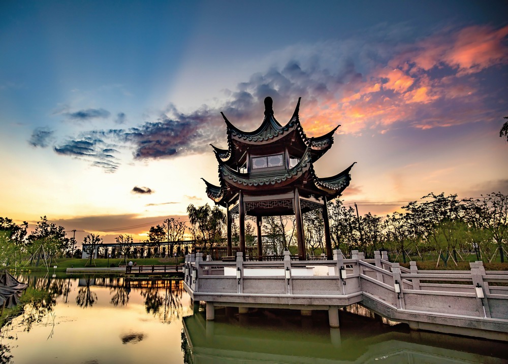 亭臺(tái)曲橋,粉墻黛瓦,勾勒出水鄉(xiāng)剪影,簡(jiǎn)單幾抹黑白和青綠,卻洋溢著中國(guó)文化的獨(dú)特神韻。