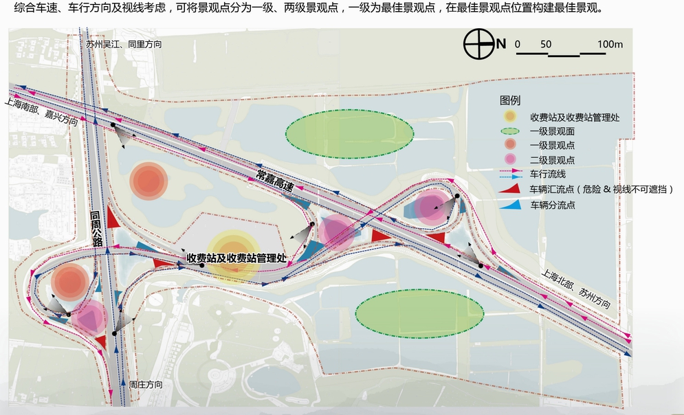 結(jié)合現(xiàn)狀分析、視線分析,綜合車(chē)速、車(chē)行方向及視線考慮,可將景觀點(diǎn)分為一級(jí)、兩級(jí)景觀點(diǎn),一級(jí)為最佳景觀點(diǎn),在最佳景觀點(diǎn)位置構(gòu)建最佳景觀。