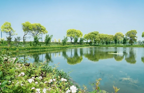 ↑ 魚(yú)塘水系和濕地蘆田景觀,凸顯水鄉(xiāng)特色