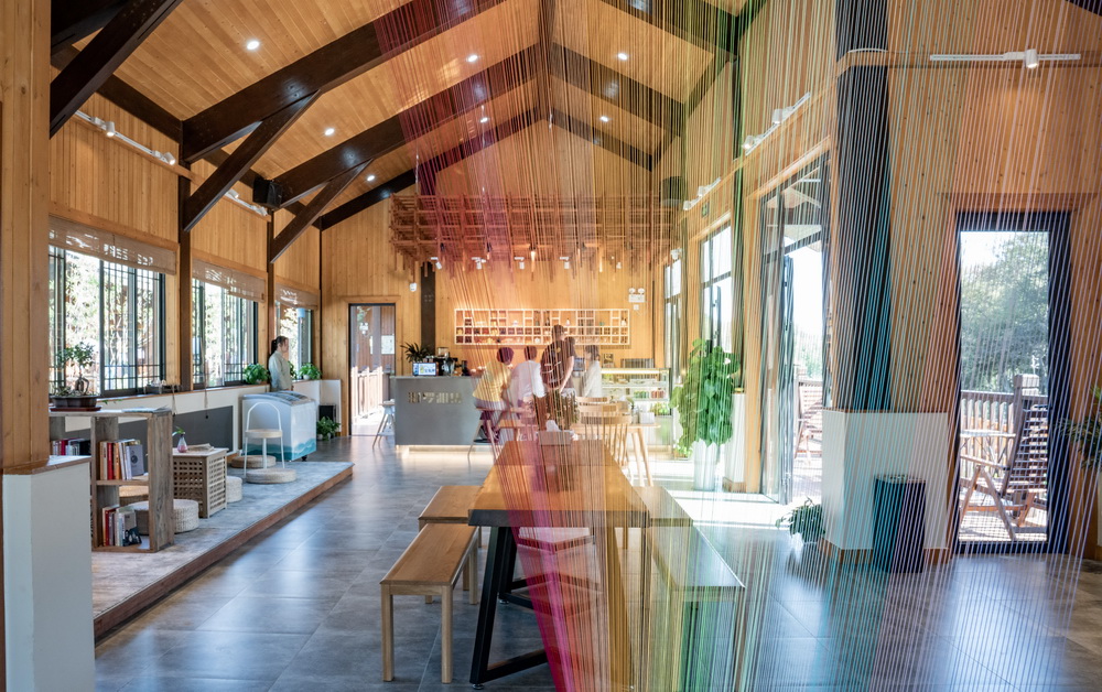 走進(jìn)驛站,建筑內(nèi)部原生木材的構(gòu)架質(zhì)樸地交織在一起,木材的清香與咖啡香味擁抱在一起。品山賞林,只愿時光凝固……