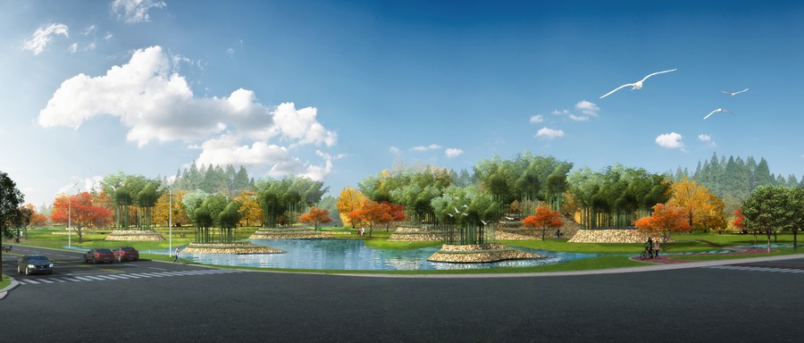 該節(jié)點為長山大道進入天目湖景區(qū)的最后節(jié)點,設計以茁壯成長的竹筍雕塑5組,以組合雕塑形式表達天目山水意向。