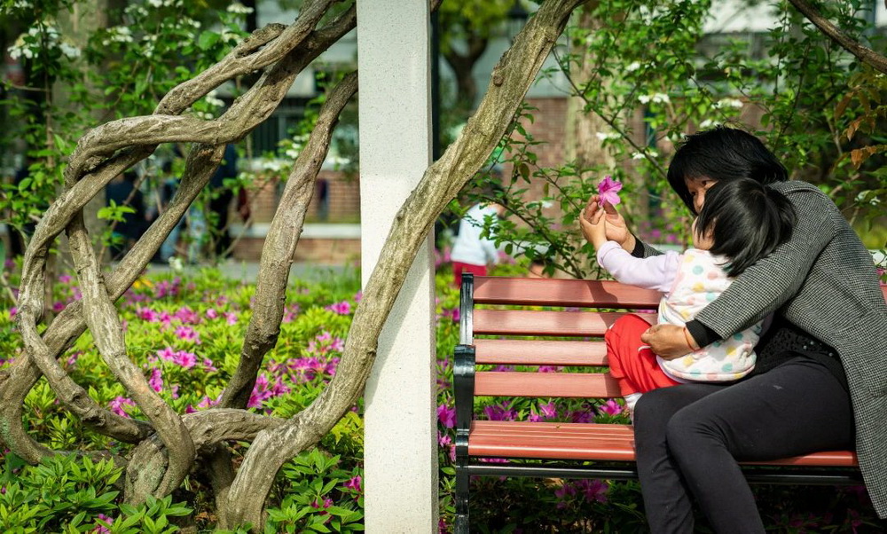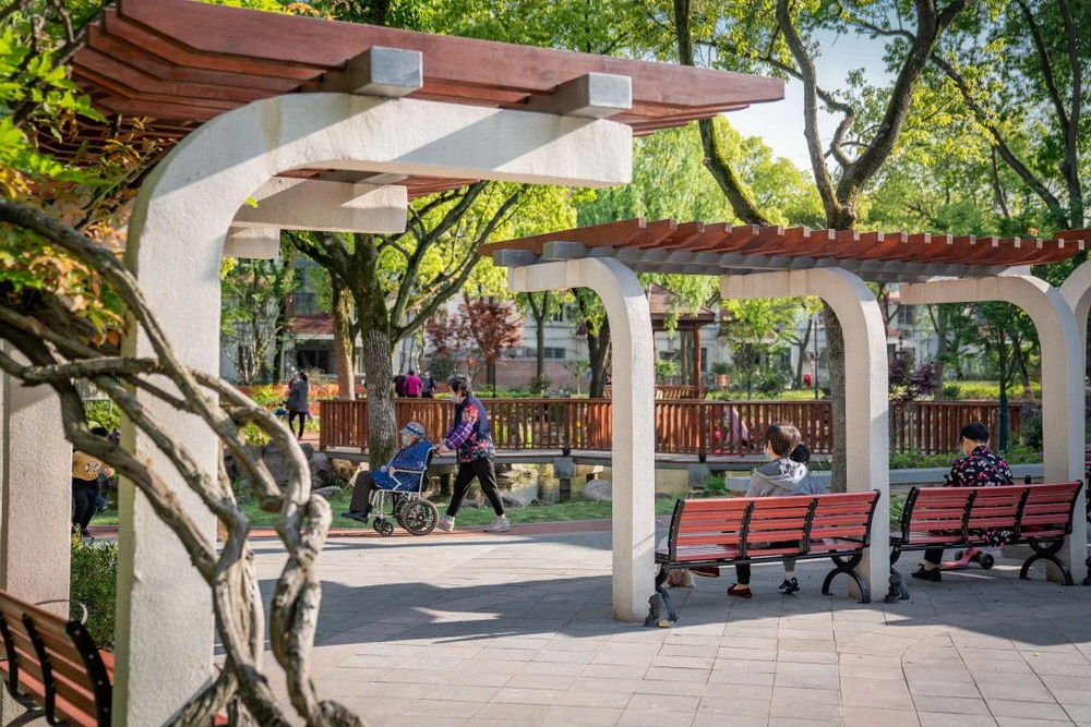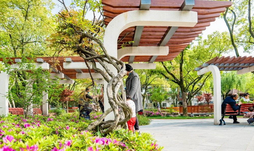 “早啊,又來(lái)鍛煉啦!”,“今天去哪里下棋?”......一大早,人樂(lè)社區(qū)內(nèi)的小游園里已經(jīng)充滿了煙火氣。幾位古稀老人在木棧道上散步,精神矍鑠;幾位爺叔圍坐在四人小桌前,“排兵布陣”,神情凝重;幾位阿姨在長(zhǎng)廊下,環(huán)抱孩童,盡享天倫;歡聲笑語(yǔ)充滿這個(gè)老城區(qū)的新花園中……