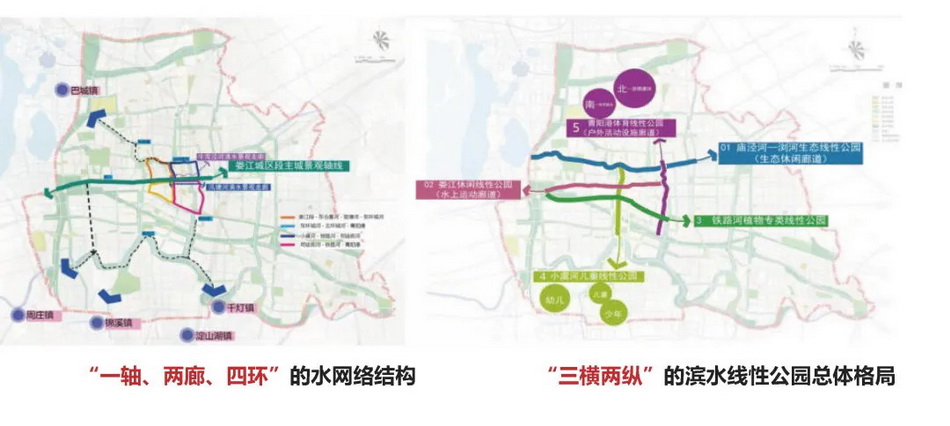 以“水網(wǎng)綠世界”為主題,做足水文章。圍繞吳淞江、婁江、致塘河等水系,通過(guò)三大策略,打造中心城區(qū)“一軸、兩廊、四環(huán)”的水景觀(guān)體系和“3橫2縱”的濱水線(xiàn)性公園格局,融水生態(tài)、水景觀(guān)、水文化于一體,營(yíng)造“藍(lán)綠交響、水路相融、水城一體”的昆山園林景觀(guān)特色。
