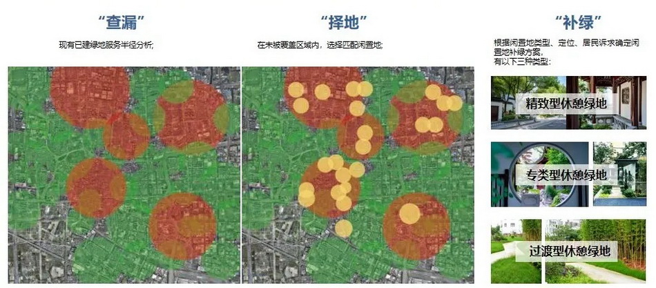 (2)精準(zhǔn)施綠:實(shí)施“查漏”-“擇地”-“補(bǔ)綠”三步走路徑,通過(guò)前期已建公園綠地量的評(píng)估分析,在公園服務(wù)半徑未覆蓋區(qū)域內(nèi),選擇匹配閑置地,并根據(jù)閑置地用地性質(zhì)、使用類(lèi)型和周邊居民訴求形成3大精準(zhǔn)覆綠模式: