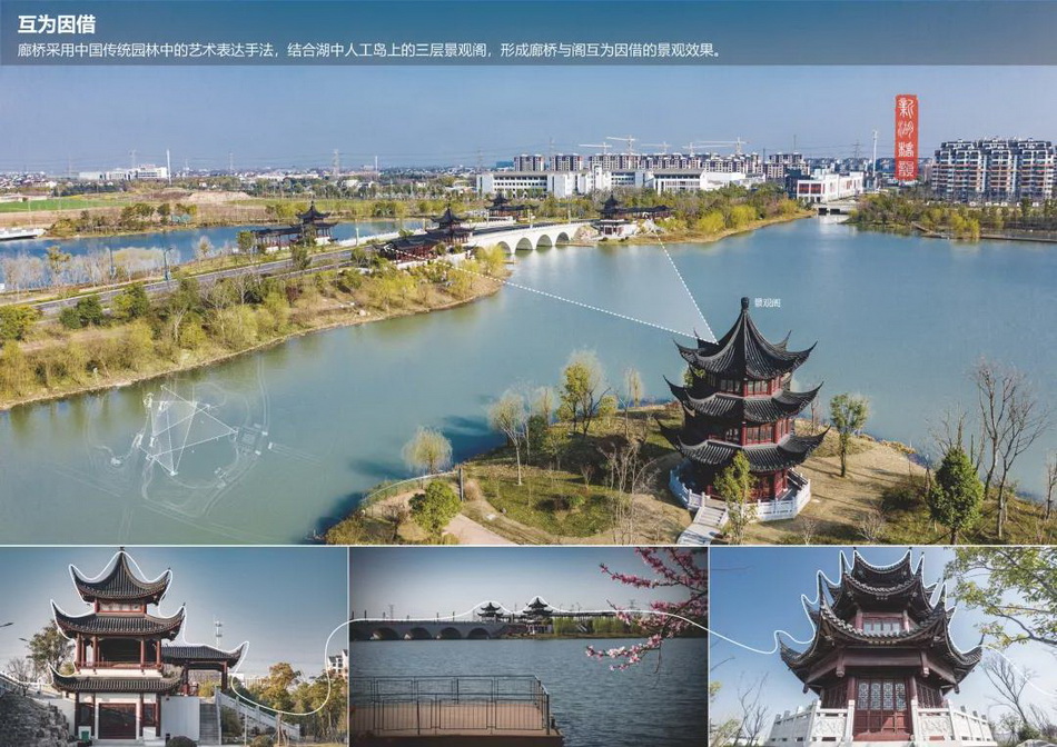 廊橋采用中國傳統(tǒng)園林中的藝術(shù)表達手法,結(jié)合湖中人工島上的三層景觀閣,形成廊橋與閣互為因借的景觀效果。