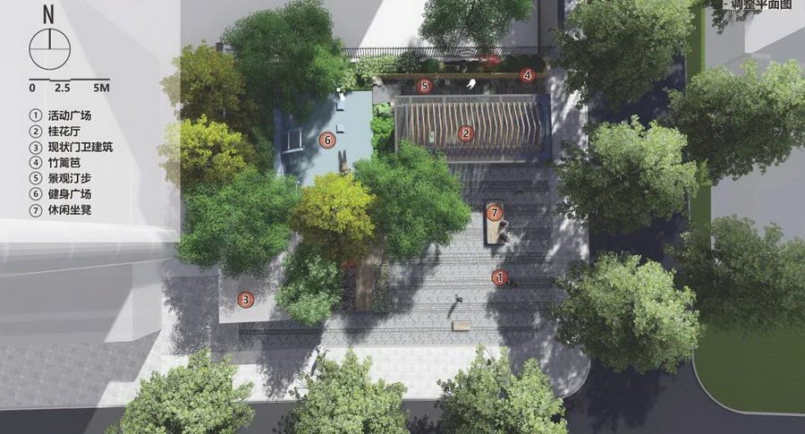 設(shè)計取昆山三徐徐秉義之耘圃為名,做“桂華廳”,西北側(cè)結(jié)合古井與小區(qū)圍欄設(shè)置少量活動場地及精致組團(tuán),使之成為昆山致塘河上具有一定歷史氣息的人文型小微游園。保留現(xiàn)狀大樹設(shè)置居民健身點(diǎn)與活動場地,嵌以花圃做游園。