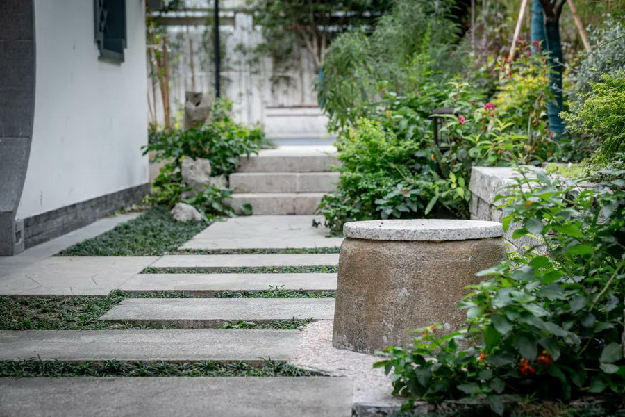 西北側(cè)設(shè)計一條汀步路,結(jié)合臺階、精致景觀燈、古井與花境的打造,把閉塞狹長的空間變成既具備交通功能又能較好的保持北側(cè)居住區(qū)的第一排居民的私密性,同時增加了精致人文氣息。