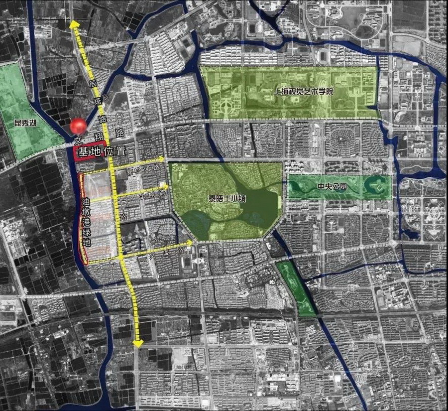該項(xiàng)目位于松江區(qū)西側(cè),文翔路與辰塔路交匯的西南角綠地,占地約 15000 ㎡,其中場地中有一塊規(guī)劃社區(qū)基礎(chǔ)設(shè)施建設(shè)用地(5000 ㎡)?;貣|段植被密布,長勢一般,主要為銀杏與夾竹桃,西段建筑設(shè)施密集,包括環(huán)衛(wèi)站、閘站管理建筑、臨時(shí)廠房等?;刂苓厼榫用裥^(qū),3公里圈層內(nèi)有昆秀湖、松江中央公園、上海視覺藝術(shù)學(xué)院、泰晤士小鎮(zhèn)、英格蘭休閑廣場等。