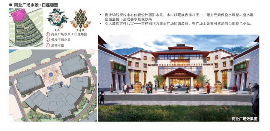 引入藏族吉祥八寶——吉祥網(wǎng)作為商業(yè)廣場的鋪裝線,在廣場上設置可移動的當?shù)靥厣∑贰?/span>