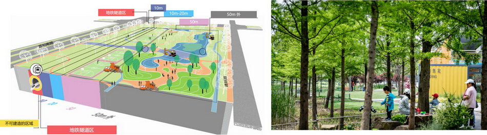 ②在地鐵隧道邊界外10-50m范圍內(nèi),采用EPS和輕質(zhì)土“等重?fù)Q填”技術(shù),基本保持原場(chǎng)地靜態(tài)荷載不變,塑造微地形與植物景觀,達(dá)到社區(qū)公園的游憩與觀賞需求。