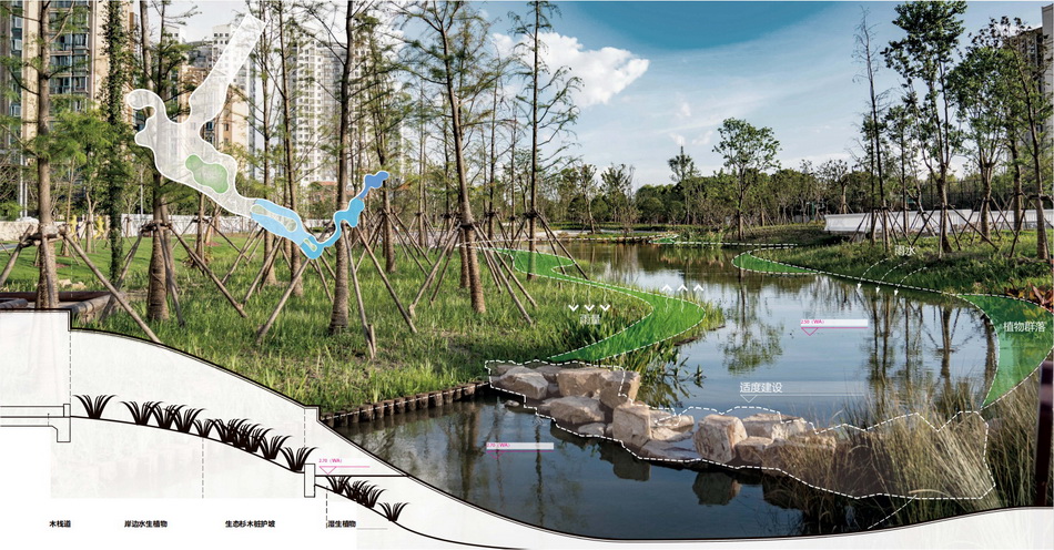 ②應(yīng)用雨洪管理理念與技術(shù),活化水系,修復(fù)水體,營(yíng)建低沖擊景觀。