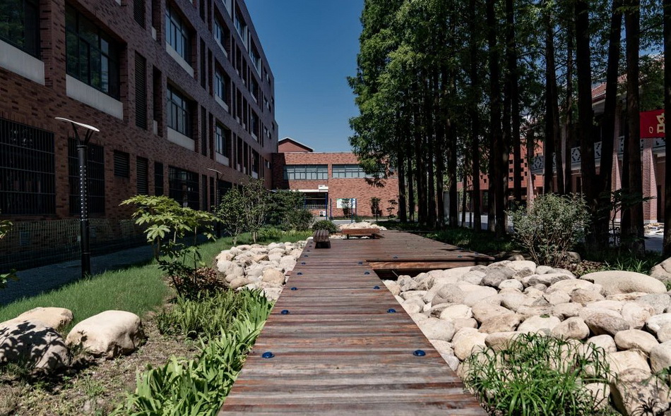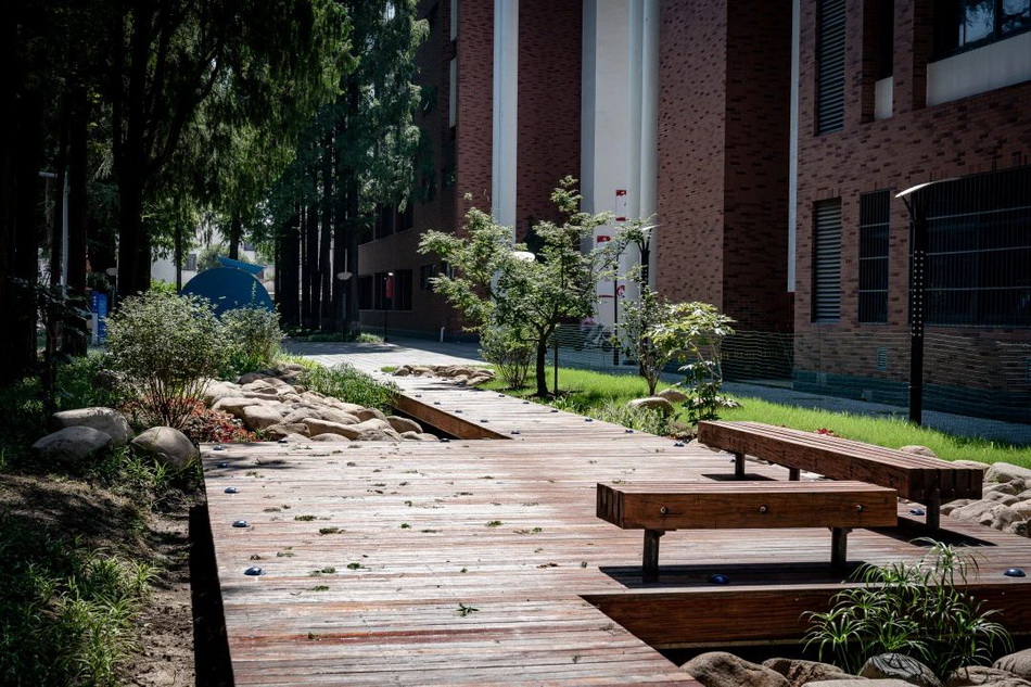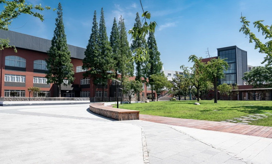 教學(xué)樓間的庭院花園保留原有喬木,流暢交通道路,增加停留座椅,自由形態(tài)的空間布局幫助師生們舒緩壓力,放松心情。