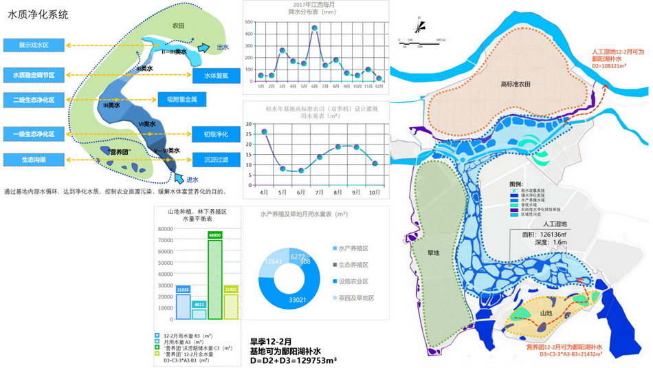 設(shè)計(jì)團(tuán)隊(duì)深入鄱陽湖區(qū)域進(jìn)行實(shí)地調(diào)研,一方面征詢相關(guān)機(jī)構(gòu)掌握準(zhǔn)確地質(zhì)水文資料,為水生態(tài)環(huán)境規(guī)劃夯實(shí)了基礎(chǔ);另一方面充分了解農(nóng)業(yè)科研、生產(chǎn)生活的需求,為解決項(xiàng)目發(fā)展面臨的問題提出切實(shí)可行的解決方案。作為該項(xiàng)目主體建設(shè)方的農(nóng)業(yè)科研機(jī)構(gòu)為整個(gè)規(guī)劃構(gòu)想提供了有力的技術(shù)支撐:包括水生態(tài)處理系統(tǒng)、循環(huán)農(nóng)業(yè)、高標(biāo)準(zhǔn)試驗(yàn)田設(shè)計(jì)、種養(yǎng)結(jié)合、生態(tài)養(yǎng)殖、魚稻共作等科研成果。