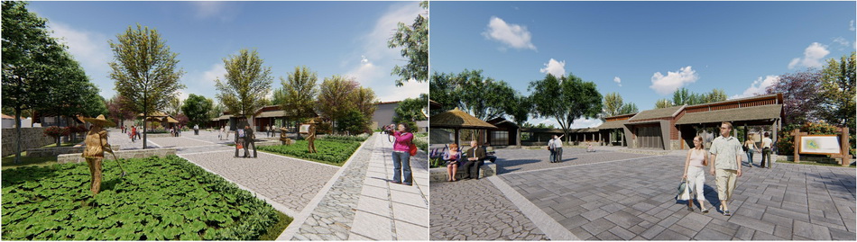 保留空地原有空間風(fēng)貌,形成村民活動(dòng)的集中廣場(chǎng)。南面建設(shè)舞臺(tái)和休憩亭廊,為村民開會(huì)和文化演藝提供場(chǎng)地,形成整個(gè)區(qū)域的產(chǎn)業(yè)文化中心。