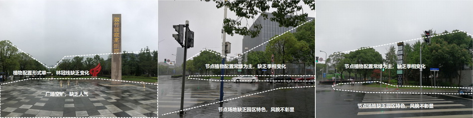 3. 節(jié)點(diǎn)綠化以常綠為主,樹(shù)形統(tǒng)一,缺乏季相變化,美感度較差。