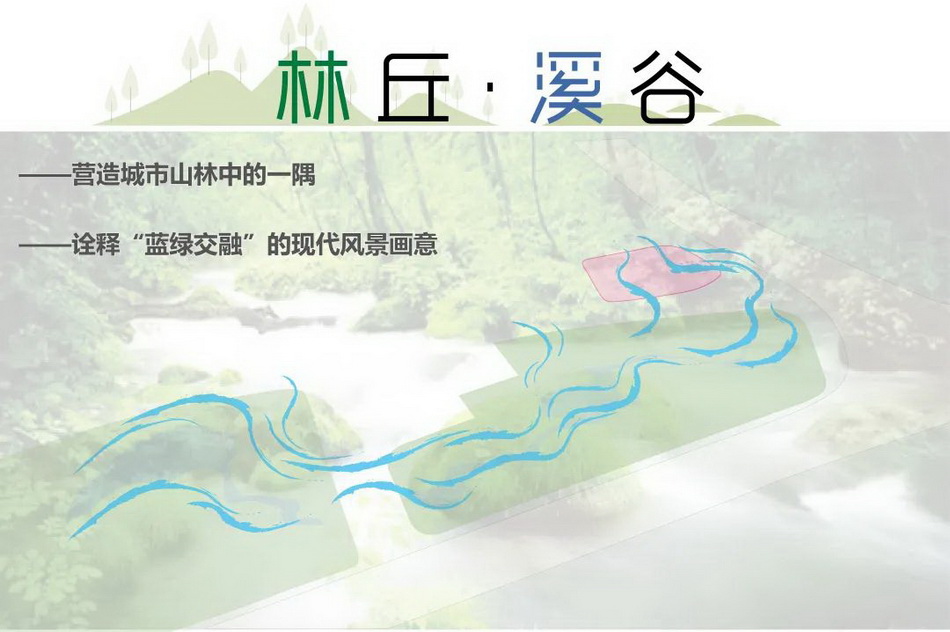 林丘秘境:林丘地形形成了圍合設(shè)施的林帶,結(jié)合霧化設(shè)施,形成了探索林丘秘境之感;局部地形高起形成結(jié)合卵石坐凳形成石溪島嶼。