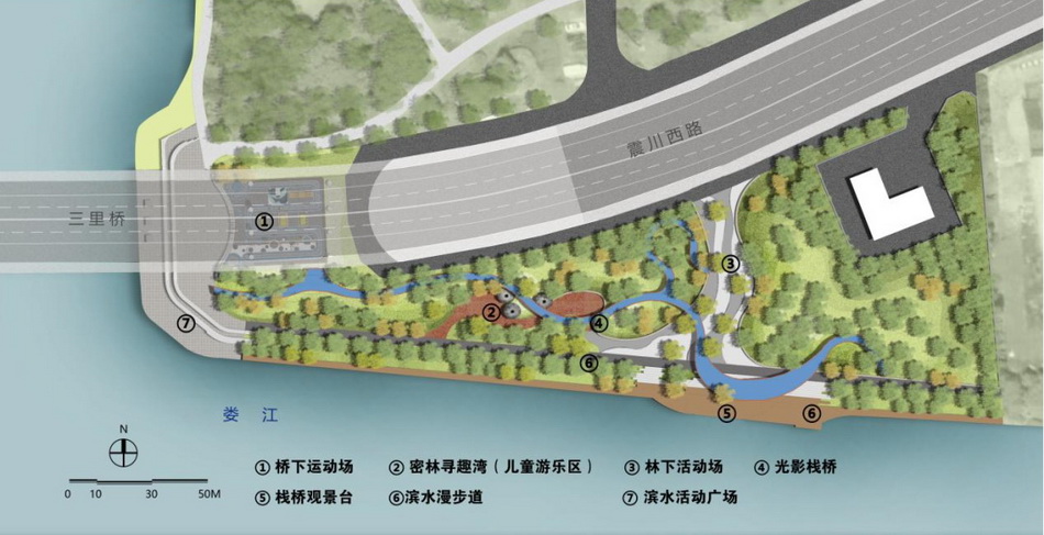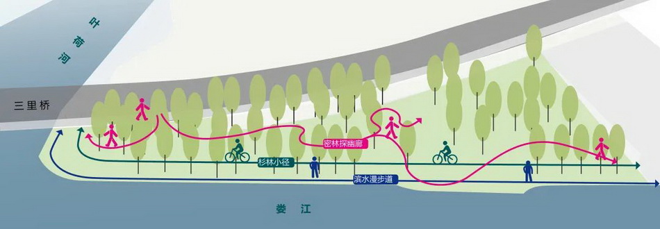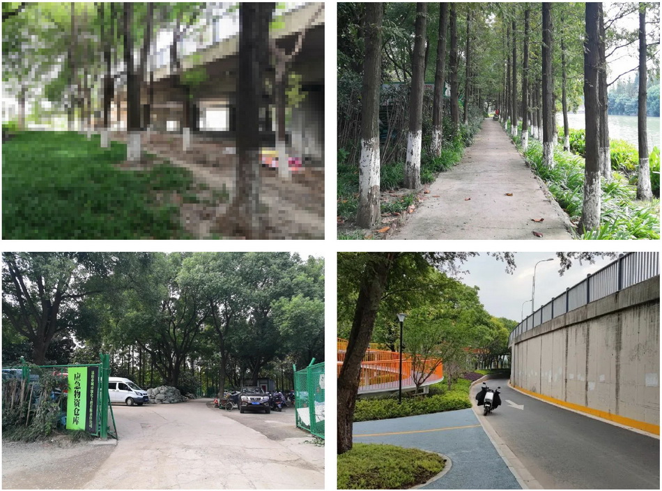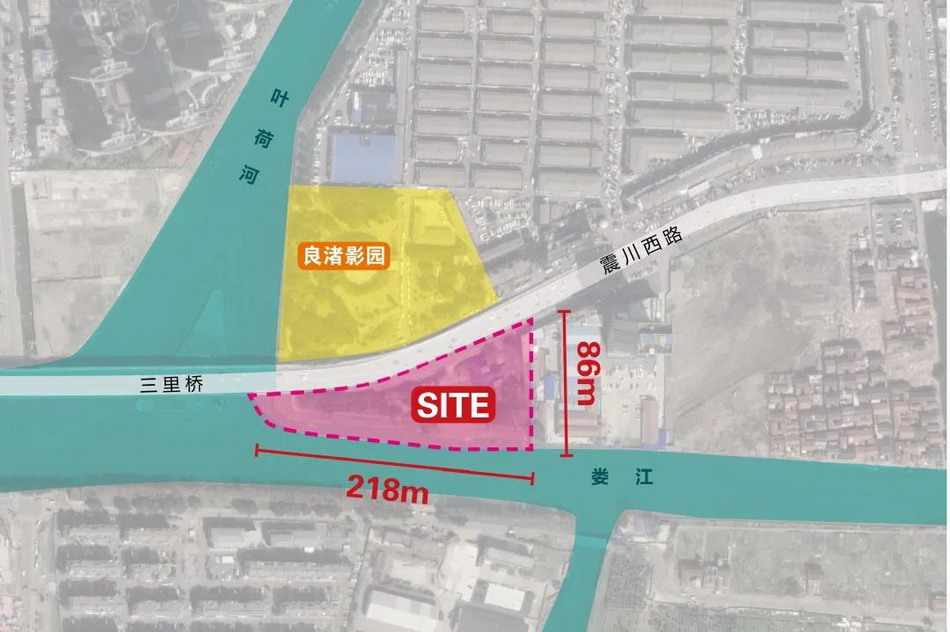 基地長(zhǎng)218m,寬86m,總面積約1.1hm2。近震川西路有大片香樟樹(shù)林,臨婁江一側(cè)有水杉林,水杉林中有寬2.4m的混凝土道路,但破損嚴(yán)重、局部缺失,且高出駁岸約1.5m,臨水不親水。震川西路三里橋引橋段直面基地北側(cè)主入口,界面生硬;部分橋下空間用青磚墻圍砌作為倉(cāng)庫(kù),與基地緊密相連的橋下空間尚未被利用,且較為昏暗。
