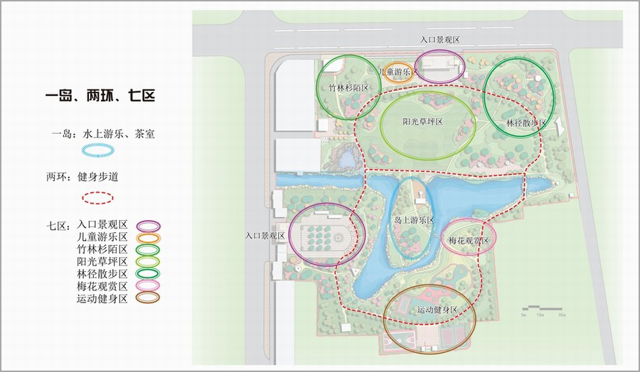 泗涇公園改造提升方案總體布局為“一島、兩環(huán)、七區(qū)”。 一島是指游樂(lè)區(qū)島;兩環(huán)是兩條環(huán)狀并列的健身步道;七區(qū)包括入口景觀區(qū)、兒童游樂(lè)區(qū)、竹林杉陌區(qū)、陽(yáng)光草坪區(qū)、臨徑散步區(qū)、梅花觀賞區(qū)、運(yùn)動(dòng)健身區(qū);注重景觀結(jié)構(gòu)與公園設(shè)施完善、歷史文化的傳承,增加趣味兒童活動(dòng)設(shè)施、靜謐休憩空間及文化活動(dòng)廣場(chǎng),滿足不同市民的偏好需求。