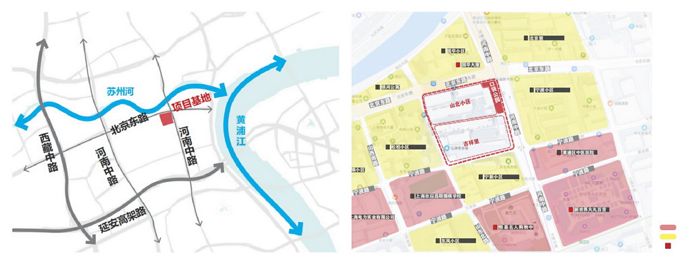基地內(nèi)的石庫(kù)門(mén)建筑竣工于1876年,是上海最早一批元老級(jí)里弄。蘇州河一帶居民生活受中國(guó)傳統(tǒng)文化及鄉(xiāng)土的影響深刻,為這兩個(gè)石庫(kù)門(mén)里弄取名為“如意里”和“吉祥里”,表達(dá)了居民對(duì)未來(lái)生活的美好期盼?,F(xiàn)“吉祥里”名稱得到保留,原“如意里”所在地為現(xiàn)在的山北小區(qū)。